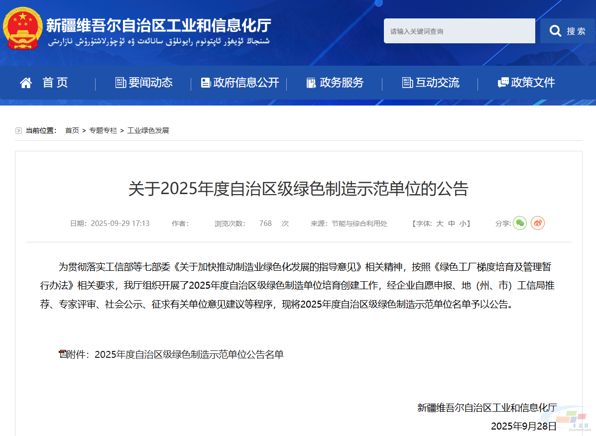 近日,新疆维吾尔自治区工业和信息化厅发布2025年度自治区级绿色制造示范单位名单,共有自治区级绿色工厂31家,自治区级绿色供应链管理企业1家,自治区级绿色工业园区1家。