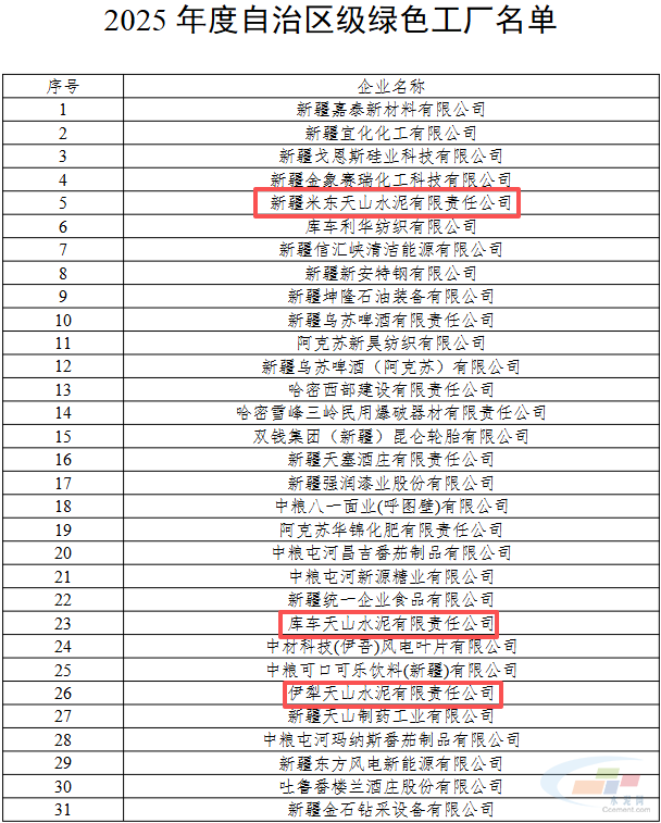 其中,新疆米东天山水泥有限责任公司、库车天山水泥有限责任公司、伊犁天山水泥有限责任公司3家水泥企业上榜。