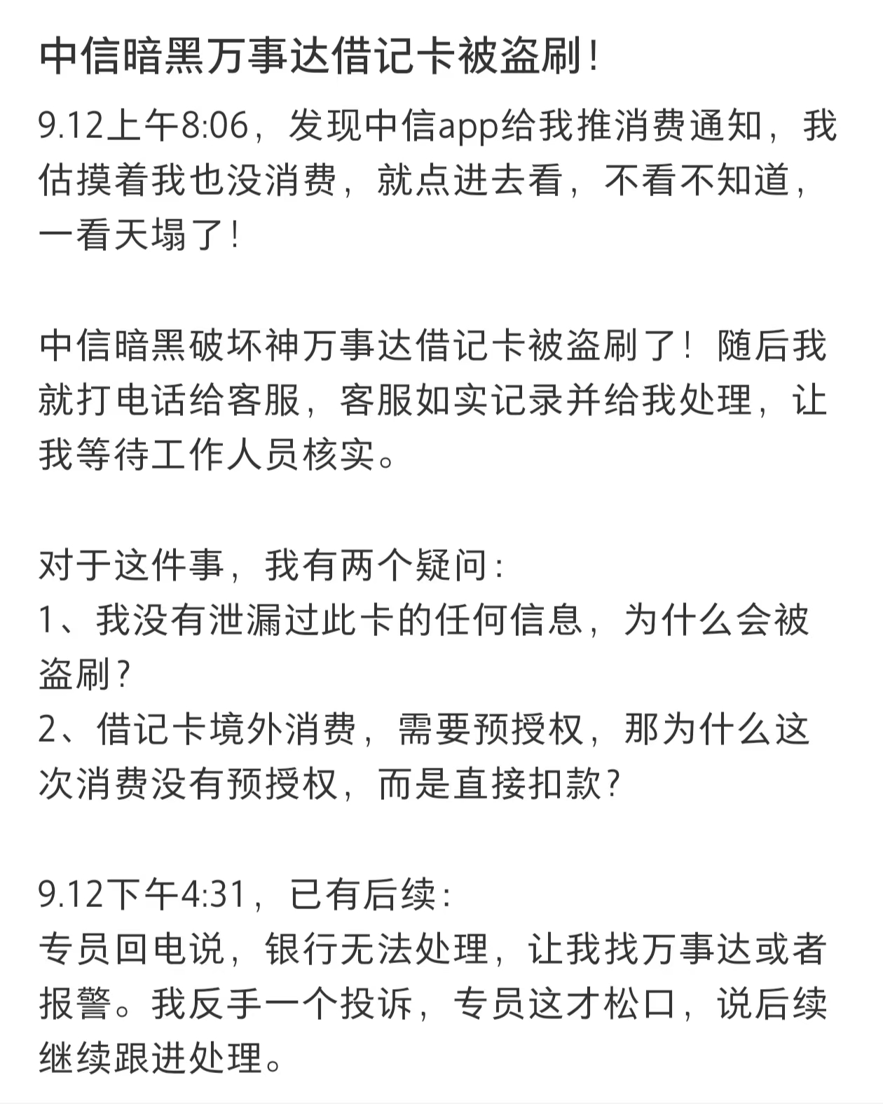 9月13日金融一线消息,近日有多名用户在社交媒体上表示,中信银行《暗黑破坏神》联名万事达借记卡被境外盗刷。有用户指出,借记卡境外消费需要预授权巨牛盈,自己被盗刷的消费记录却未经预授权直接扣款。目前该事件仍在处理中。